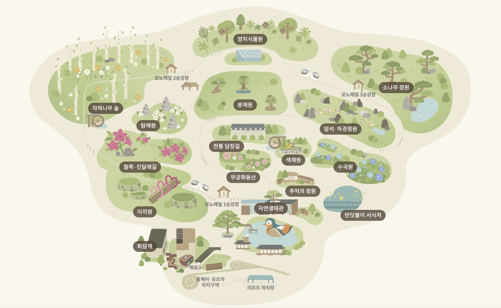 - 주요 시설: 화담채 (미디어 아트 전시관 + 옥상정원), 모노레일, 다양한 테마 정원 (이끼원, 자작나무 숲, 분재원 등)
