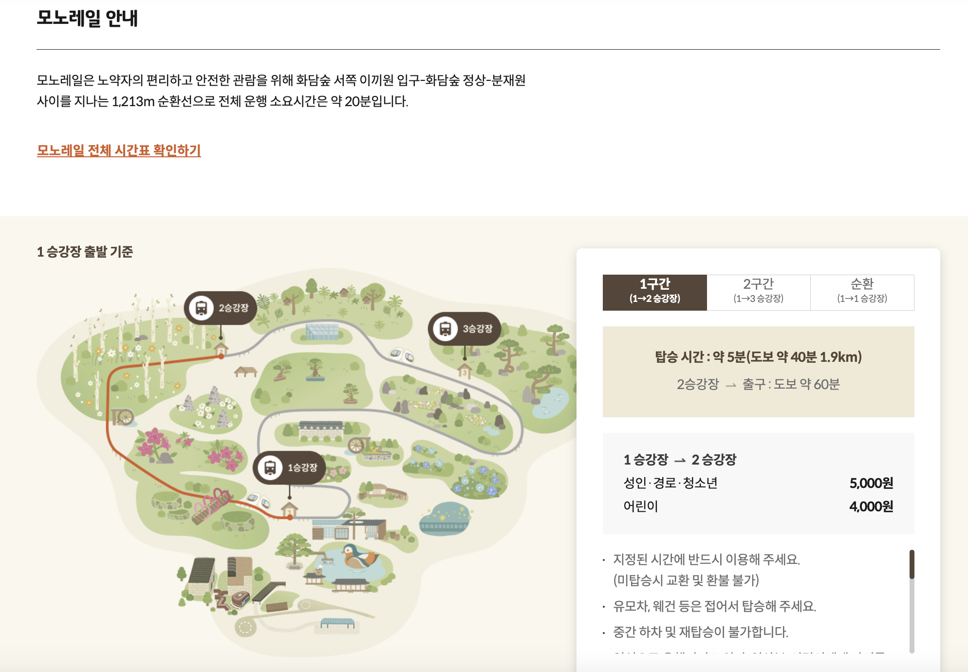 - 모노레일 이용료: 순환 기준 성인 9,000원, 어린이 7,000원