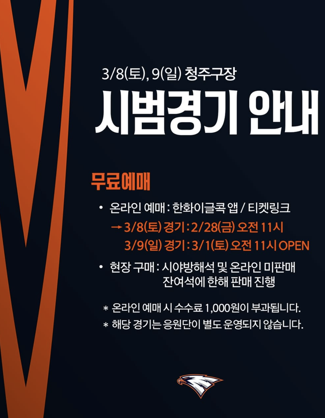2025 시즌, 한화이글스의 힘찬 비상을 위한 첫걸음! 시범경기에서 선수들의 열정을 직접 확인하고, 뜨거운 응원으로 함께해주세요! 승리의 함성으로 가득 찰 대전 한화생명 이글스파크에서 여러분을 기다립니다!