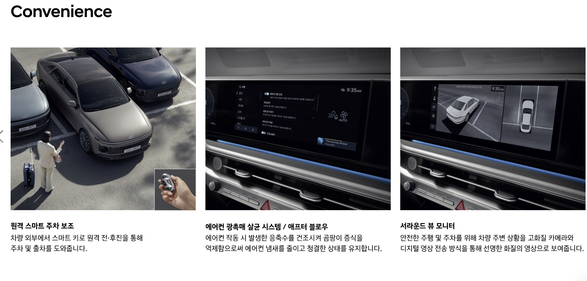 캘리그래피 전용 인테리어는 나파가죽 스티어링 휠, 리얼 우드/알루미늄/나파가죽 트리밍, 앰비언트 무드램프 등 고급 소재와 디자인으로 프리미엄 세단의 감성을 극대화합니다. 10.25인치 터치스크린 공조 패널은 직관적인 조작을 돕고, 14스피커 Bose 프리미엄 사운드 시스템과 액티브 노이즈 캔슬링은 최상의 음향 환경을 제공합니다.