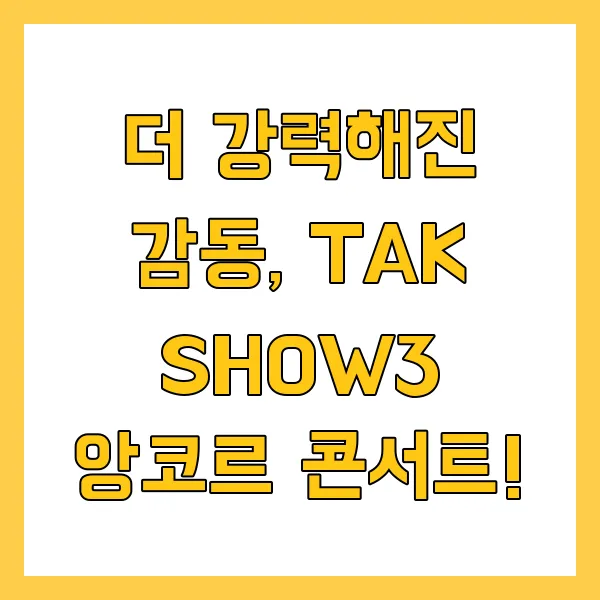 이번 앙코르 콘서트에서는 기존 "TAK SHOW3"의 히트곡들을 새로운 편곡과 퍼포먼스로 만나볼 수 있을 뿐만 아니라, 팬들의 사랑을 듬뿍 받았던 곡들의 스페셜 무대까지 준비되어 있습니다. 또한, 앙코르 공연만을 위해 특별히 준비한 깜짝 무대까지?! 상상 그 이상의 감동과 재미로 꽉 채워질 예정이니, 절대 놓치지 마세요!