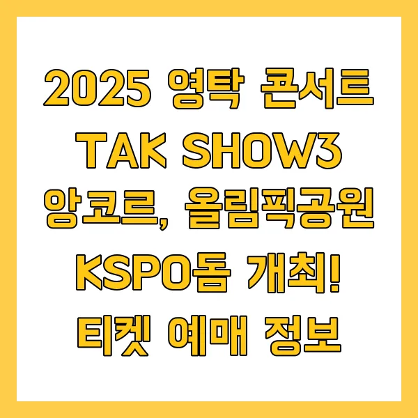가수 영탁의 2025년 단독 콘서트 "TAK SHOW3" 앙코르 공연이 드디어 올림픽공원 KSPO돔에서 개최됩니다! 팬들의 뜨거운 성원에 힘입어 다시 돌아온 이번 콘서트, 놓칠 수 없겠죠? 티켓 예매 정보, 공연장 정보, 그리고 더욱 풍성해진 앙코르 공연의 매력까지, 지금 바로 확인하세요! 영탁 콘서트, KSPO돔, 티켓 예매, 앙코르, 올림픽공원 등의 키워드로 검색하면 자세한 내용을 찾아볼 수 있습니다.